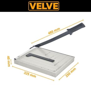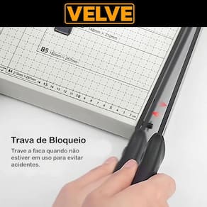 Especificações técnicas: Tamanho: até a4; Capacidade de corte: até 12 folhas; Base em metal; Base com marcação em centímetro; Marcações nos tamanhos a4, b5, a5, b6 e b7; Faca com mola e trava automática; Faca com cabo em abs; Pés emborrachados; Dimensões do produto: 48cm x 25cm x 4cm.
