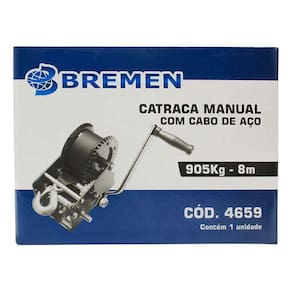 Guincho Catraca Manual 905Kg com Cinta de Nylon 8m BREMEN - 4659 CaracterísticasCatraca Manual com Manivela, Capacidade de 905Kg e Cinta de Nylon de 8 MetrosEm AçoCom Cinta em NylonGancho com Lingueta de SegurançaCódigo: 4659Modelo: ManualMarca: Bremen Especificações TécnicasTipo: ManualCapacidade de Carga: 905KgComprimento da Cinta: 8 MetrosLargura da Cinta: 50mmDimensões: 180 x 130mmPeso: 4,908Kg Imagens Meramente Ilustrativas.Todas as Informações Divulgadas São de Responsabilidade do Fabricante/Fornecedor