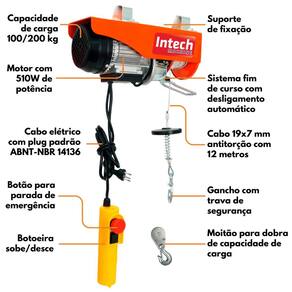 Guincho Elétrico 100/200kg Talha Elevação 12m ELEV200 Intech - 220V