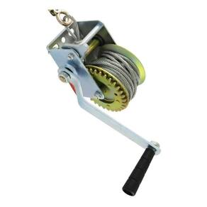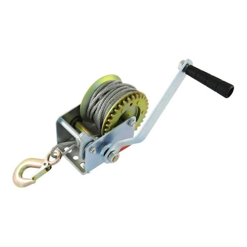 Guincho manual catracado com cabo de aço Suporta até 270 Kg / 600 Libras Comprimento do cabo: 6 metros Corpo metálico galvanizado Garra e gancho de segurança Eixo de manivela rolamentado