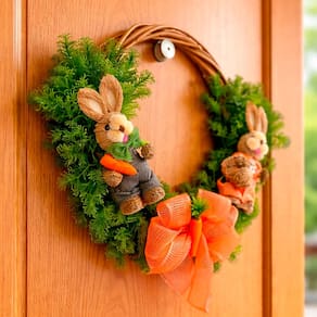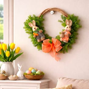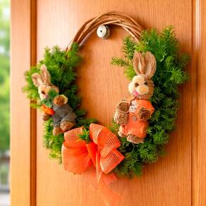 Encante sua casa nesta Páscoa com uma guirlanda charmosa de casal de coelhos. Ideal para portas, paredes ou ambientes internos, traz um toque acolhedor e festivo para receber a família e os convidados