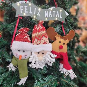 Bonecos em Pelúcia: Rosto do Papai Noel, Boneco de Neve e Rena que dão um toque divertido e aconchegante.
