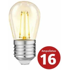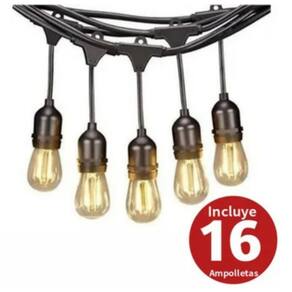 Guirlanda decorativa de 15 metros para 15 ampoletesGuirlanda perfeita para decorar seus espaços, você pode usá-la em ambientes internos ou externos. Impermeável, ideal para Quinquos, terraços e muito mais. Com soquetes de rosca dupla E27. Base: 15 soquetes E27\ nVoltagem: 220-240 (V)\ nDimensões: 15 metros\ nMaterial: silicone\ n- Os soquetes têm uma borracha; quando a ampola é colocada, a base é isolada.\ NiP: 65 - Adequado para exterior e interior. Inclui 15 ampolas mais 1 ampola de reposição\ n4 Watts Vintage