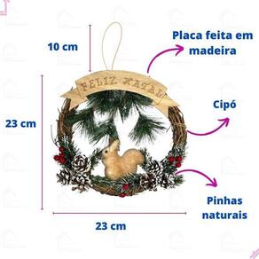 O natal é tempo de celebrar o amor, comemorar a vida com novas esperanças, novos sonhos e também é a hora de deixar a casa mais bonita para receber a família nesta data tão importante. Feita com materiais de qualidade, esta guirlanda de natal, trará todo um charme que irá contagiar seu ambiente, o item perfeito para decorar sua casa e aguardar a chegada do bom velhinho. Esta guirlanda é confeccionada com materiais de qualidade, possui um lindo design contendo um esquilo, placa de feliz natal em madeira, detalhes em festão verde, pinhas naturais e decoração de pequenas cerejas, que deixarão sua decoração rica em detalhes. Tamanho ideal, sendo 23 cm e você poderá usar tanto na decoração da sua casa quanto de sua empresa.
