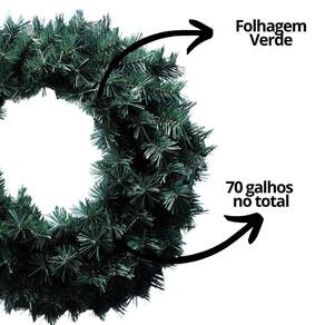 Deixe sua decoração natalina ainda mais sofisticada com a guirlanda verde, desenvolvida para oferecer volume e enchimento completo. Composta por 70 galhos de PVC de alta qualidade e estrutura reforçada em metal, ela possui 45cm de diâmetro, ideal para dar destaque em portas de entrada, paredes ou até mesmo como centro de arranjos festivos.