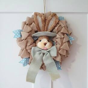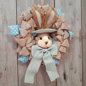 Encante sua casa nesta Páscoa com esta linda guirlanda decorativa de cabeça de coelho, perfeita para portas, paredes e ambientes temáticos. Com acabamento artesanal e um delicado laço decorativo, traz charme, aconchego e espírito pascal à sua decoração