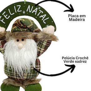 Transforme sua decoração natalina com a Guirlanda Placa Feliz Natal em madeira decorativa, acompanhada de um charmoso Papai Noel em pelúcia com roupa verde xadrez e gorro em crochê. Uma peça cheia de aconchego e estilo, perfeita para dar as boas-vindas e criar um clima festivo já na entrada da sua casa.