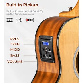 - ? [Fácil de carregar e tocar] Em comparação com a guitarra de tamanho maior, a guitarra acústica elétrica de 91 cm é mais fácil de transportar para viagens. A haste de treliça integrada permite que você ajuste a ação da corda para manter o pescoço reto. Além disso, o corte ergonômico é uma verdadeira vantagem de que você pode descansar a guitarra na perna com facilidade para acessar os trastes mais altos