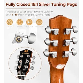 ? [Guitarra acústica elétrica] A guitarra acústico-elétrica Vangoa de tamanho 3/4 possui corpo estilo modelo orquestra produzindo um som brilhante e claro com resposta de frequência mais alta. Ele também oferece melhor projeção e mais ressonância graças à combinação clássica de Spruce superior e Sapele lateral e traseira. A ponte de nogueira de 0 cm mais fina otimiza a ressonância acústica para a frequência mais alta e mais baixa para um som mais equilibrado, serve para mais estilos de reprodução ou música. ? [Ampla aplicação] A guitarra de viagem pode produzir som acusticamente como um violão acústico comum. A guitarra acústica elétrica de 91 cm tem um sintonizador embutido, equalizador de 2 bandas (graves e agudos) e controle de volume que oferece a opção de conectar a um amplificador acústico, mixer ou sistema PA para atender à sua necessidade de conectar no palco para apresentação ao vivo ou no estúdio para gravação. ? Compatível com guitarra de tamanho maior, guitarra elétrica acústica de 91 cm com corpo OM é mais leve para jogar se você está sentado ou em pé. Você pode facilmente levá-lo para aulas, viagens ou onde quer que você vá. ? [Durável e reproduzível] A ação adequada da corda da guitarra acústica elétrica 3/4 permite que você se sinta confortável tocando. A haste de treliça integrada permite que você ajuste a ação da corda para manter o pescoço reto e tornar a guitarra de 91 cm mais facilmente tocável. Os recortes ergonômicos dão a você acesso mais fácil aos trastes mais altos ? [Ajuste rápido] Os pinos de ajuste de níquel selados são mais duros, mais duráveis e mais resistentes ao desgaste do que os pinos de ajuste cromados, engrenagens de proporção 18: 1 aumentam a estabilidade e a precisão na afinação. Cordas de bronze fosforoso atualizadas, porca óssea e selim estabilizam a guitarra e facilitam a afinação e a afinação ? [Kit completo] A guitarra elétrica acústica 3/4 vem com quase tudo o que você precisa para começar, como um manual do usuário, bolsa de violão, chave Allen, afinador, cordas extras, dois pinos de ponte extra, alça para tocar em pé, capo, cabo amplificador para conectar, pano de polimento, pickguard