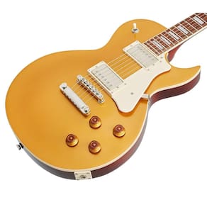 Guitarra Cort CR200 GT Les Paul Gold Top A Cort CR200 é uma guitarra de corte único Les Paul , que, graças ao seu preço favorável e acabamento de qualidade, certamente pode atrair jovens aspirantes ao rock, bem como músicos experientes e tecnicamente qualificados. O corpo da guitarra é feito de mogno. Adjacente ao braço colado, também em mogno, está uma escala de jatobá, conhecida como cerejeira brasileira, equipada com vinte e dois trastes. A orientação ao longo de sua superfície é facilitada por blocos posicionais feitos de imitação de madrepérola. Dois captadores PAF inspirados nos humbuckers ClassicRocker II com ímãs Alnico II dão à guitarra um rock completo, mas também um som limpo e agradável quando necessário. Potenciômetros de volume, barreiras de tom e um seletor de captação de três posições são para ajustá-lo. Nut feito de material Graphtech NuBone e sua fixação no arremate por meio de uma ponte Tune-O-Matic fixa garante a transmissão ideal das vibrações das cordas para o corpo do instrumento. A aparência elegante do instrumento é sublinhada por mecanismos de afinação de design vintage, hardware de níquel, pickguard brilhante e o logotipo da empresa no cabeçote da guitarra. Parâmetros Cor do fabricante: Gold Top Cor: Dourado Tratamento de superfície: Brilho Tipo de guitarra: Single-cut Corpo: Mogno Braço: Mogno Perfil do pescoço: C Escala: 628 mm Raio: 12 Número de trastes: 22 Largura do Nut: 43 mm Escala: Jatobá Configuração do sensor: HH Modelo dos captadores: 2x ClassicRocker-II Controle: 2x Volume, 2x Tom Chave de posição: 3 posições Tarraxas: estilo vintage Hardware: Níquel Cordas: D'Addario EXL110 País de fabricação: Indonésia Marca: Não Informado