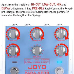 - JOYO O pedal de reverberação estéreo possui 9 tipos de reverberação digital integrados, além do tradicional ajuste MIX, HI-CUT, LOW -CUT e Decay. Cada tipo de efeito pode ser armazenado como uma predefinição para facilitar a recuperação