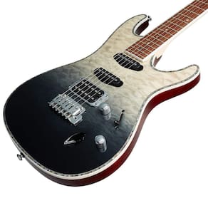 Guitarra Ibanez SA360NQM-BMG Black Mirage Gradation A série SA da marca japonesa Ibanez apresenta guitarras elétricas com características sonoras versáteis. Elas podem ser facilmente identificadas entre outras guitarras Ibanez por seu tampo arqueado, tremolo sincronizado e configuração de captação HSS.