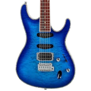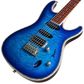 Guitarra Ibanez SA360NQM-SPB Super Strat Sapphire Blue A série SA da marca japonesa Ibanez apresenta guitarras elétricas com características sonoras versáteis. Elas podem ser facilmente identificadas entre outras guitarras Ibanez por seu tampo arqueado, tremolo sincronizado e configuração de captação HSS.