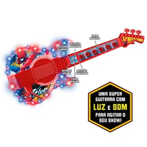 Guitarra Infantil Musical com Luz e Som - Marvel Spiderman - Toyng: Hora do show com a Guitarra Musical com Luz e Som do Homem-Aranha! Essa guitarra eletrônica vem com várias funções e toca diferentes tipos de sons, além disso, ela pode ser conectada em um smartphone ou mp3 player para cantar junto. Detalhes: • A Guitarra Spiderman acende luzes e toca sons de verdade • Uma super guitarra com luz e som para agitar o show • Com botões de: seleção de modos, seleção de sons, volume, liga/desliga e notas musicais • Conecte a guitarra em um smartphone ou mp3 player e cante junto • Ideal para as brincadeiras musicais e para despertar a paixão pela música nas crianças Informações: • Produto: Guitarra Spiderman Musical • Marca: Toyng • Coleção: Spiderman (Homem-Aranha) • Linha: Marvel • Tipo: Guitarrinha de brinquedo com luz e som • Categoria: Instrumentos Musicais de Brinquedo • Subcategoria: Guitarras Infantis • Tamanho: 50 cm aproximadamente • Conteúdo: 01 Guitarra • Recomendação: para crianças a partir de 04 anos de idade Especificações: • Modelo: Guitarra Musical com Luz e Som Homem Aranha • Referência: 51094 • Código de Barras: 7899871622038 • Embalagem (C x A x L): 50 x 21 x 05cm • Embalagem (Peso): 0.458 kg • Material / Composição: Plástico • Funcionamento: à pilhas - 03 pilhas AA 1.5v (não inclusas) • Registro: 007822/2023 • Certificado: Órgãos Autorizados - OCP´S (Organismos de Certificação de Produtos) Aviso: • As imagens são meramente ilustrativas • Os pesos, tamanhos e medidas são aproximados • As cores e estampas dos produtos podem ter variações • As informações são de responsabilidade do fabricante ou fornecedor