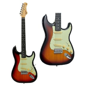 EspecificaçõesCORPO: BasswoodBRAÇO: Maple Shape CESCALA: Tech wood 22 trastes C 25.5 Raio 9.5NUT: Plástico 43mmCAPTADORES: 3 Single coils cerâmicos by TagimaCONTROLES: 1 Chave seletora de 5 posições, 1 Volume e 2 TonalidadePONTE: TremoloTARRAXAS: DiecastCores:sunburstESCUDO: Mint green