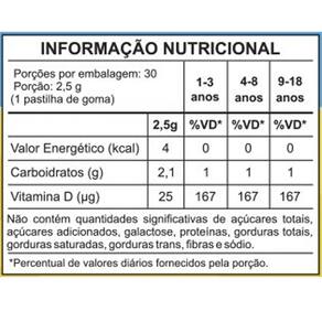 Bioviton Gummy Kids é um suplemento alimentar em goma com vitamina D3, especialmente desenvolvido para o público infantil. Com sabor agradável de laranja, a fórmula traz praticidade e uma forma divertida de complementar a alimentação diária das crianças. A vitamina D3 é um nutriente essencial que contribui para a absorção e utilização adequada do cálcio e fósforo e também dos processos metabólicos relacionados ao funcionamento do sistema imunológico. - Modo de ingestão 1 Goma ao dia.