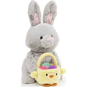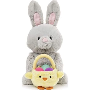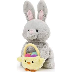 Hippity hoppity, o coelhinho da Páscoa está pronto para sua época favorita do ano com uma cesta cheia de guloseimas! Este coelh cinza de pelúcia de 10" é o tamanho perfeito para qualquer cesta de Páscoa e mantém sua própria cesta de pintinhos amarelos peludos com detalhes adoráveis bordados do rosto e ovos de pelúcia coloridos dentro. Feito exclusivamente para a Amazon, este coelhinho doce da Páscoa é lavável na superfície, linha seca para fácil limpeza e apropriado para idades de um ano ou mais.