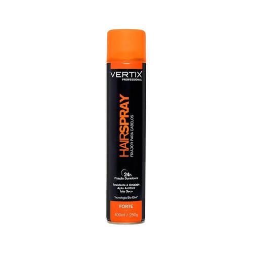 Hair Spray Forte 400ml Vertix Prolonga o efeito modelar franjas e mechas. Características • Tecnologia Bio Elixir: uma combinação de óleos nutritivos, vitaminas e sais minerais, que não ressecam os fios. • Tecnologia Flexível: permite que o produto seja retirado com água ou penteando os cabelos com uma escova, sem agredi-los. • Fixação flexível e duração de 24h. • Resistente à Umidade • Ação Antifrizz • Jato Seco • Perfeito para modelar qualquer tipo de penteado