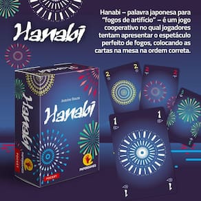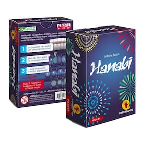 Hanabi Linha Hanabi - palavra japonesa para fogos de Artifício - é um jogo cooperativo no qual jogadores tentam apresentar o Espetáculo perfeito de fogos, colocando as cartas na mesa na ordem Correta. Parece fácil, certo Bem, nem tanto, pois neste jogo Você segura suas cartas de forma que elas fiquem visíveis apenas aos outros Jogadores. Isso mesmo, você não pode ver suas próprias cartas Vocês devem trabalhar em Time, dando dicas uns aos outros a respeito dos valores ou das cores das Cartas de cada um para criar um deslumbrante espetáculo de fogos antes que acabem Suas cartas. Além da arte totalmente Renovada, esta nova edição de Hanabi inclui 2 expansões Dentro da caixa: Avalanche de Cores e Pólvora Negra, que Acrescentam novos níveis de dificuldade nas partidas. Hanabi venceu o Spiel des Jahres de 2013, uma das principais premiações de jogos do mundo. Homologação Inmetro: IP-BRI-2312/2021-03