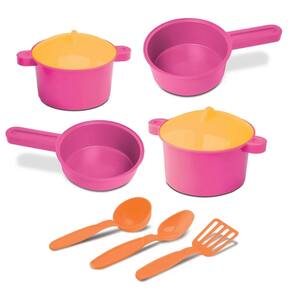 Happy House Jogo de Panelas, jogo com 4 panelas e 3 utensílios, amarelo, rosa e laranja, 8 cm, plástico, 7 peças, +24 meses - Samba Toys
