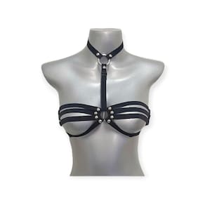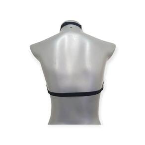 Confeccionado com elástico preto de alta qualidade, este harness garante um ajuste perfeito ao corpo, graças ao seu sistema de regulagem. O design tomara que caia, uma escolha audaciosa e sensual, é elevado pela presença de uma tira única que sobe até o pescoço, adornada com rebites e argolas metálicas que não apenas reforçam a estética punk-chic da peça, mas também adicionam um elemento de textura e profundidade ao visual.