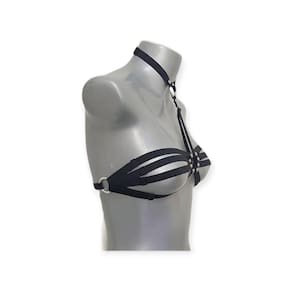 Os detalhes metálicos são cuidadosamente aplicados, criando um contraste intrigante com o preto do elástico, o que faz desta peça um acessório de destaque. Perfeito para ser em diversas ocasiões, desde eventos noturnos até festivais de música ou mesmo como um elemento surpresa em um look casual, este harness é versátil e se adapta a diferentes estilos e preferências.
