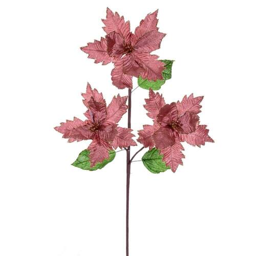 - Esta haste de poinsétia Velvet Trio Razor, cor de ouro rosa, é feita de poliéster e arame e tem 26 polegadas de comprimento com uma cabeça de flor de 6 polegadas de diâmetro.