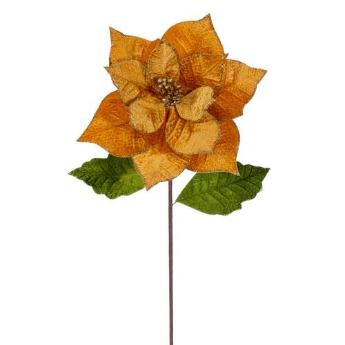 - Este caule de poinsétia de veludo clássico dourado é feito de poliéster e arame e tem 20 polegadas de comprimento com uma cabeça de flor de 12 polegadas de diâmetro.