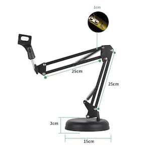 Haste flexível com base redonda- Excelente estabilidade e capacidade de carga.- Proporciona um visual limpo e profissional para a sua estação de gravação.- Não ocupa o espaço útil em excesso de uma mesa ou superfície, pode ser removido facilmente.- Tamanho da haste: 50 cm 25 cm + 25 cm .- Diâmetro da base: 15 cm- Altura da base: 3 cm- Capacidade de carga: 1,5 kg- Material: aço, plástico- Cor: preto Marca: Aj Som Acessórios Musicais