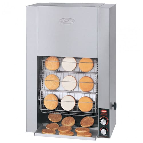 Torradeira vertical de esteira com 3 zonas de aquecimento separadas. Velocidade ajustável da esteira para controle de cor. Permite torrar 3 partes de pães de hambúrguer simultaneamente. Capacidade de até 1550 fatias por hora.Aquecedor de pão