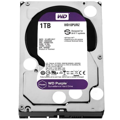 HD Interno 1TB SATA III 64MB Purple WD10PURZ Western Digital, projetado para sistemas de segurança de alta definição e funcionamento contínuo. Possui tecnologia AllFrame 4KTM para desempenho e confiabilidade em gravações de vídeo. Interface SATA III para transferência de dados em alta velocidade. Carga de trabalho nominal de até 180 TB/ano e suporte para até 64 câmeras.Capacidade