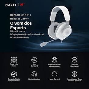 O Headset Havit H2230U eleva o patamar da sua experiência digital com o poder do áudio via conexão USB. Desenvolvido para entregar um som mais limpo e livre de interferências analógicas, este modelo é perfeito para quem busca processamento de áudio superior no PC ou notebooks. Com um design moderno e clean, ele une a tecnologia de som surround com o conforto absoluto das almofadas premium da Havit. Sobre a Marca Consolidada como uma gigante no setor de tecnologia gamer, a Havit foca em entregar periféricos que unem design arrojado e performance técnica. No Brasil, é a marca preferida de quem busca equipamentos de nível com durabilidade testada e aprovada por milhares de usuários. Funcionalidades Conexão USB Digital Plug and Play para maior fidelidade sonora. Microfone removível com cancelamento de ruído passivo para chats nítidos. Drivers de 50mm otimizados para equalização de graves e agudos. Haste flexível anti-quebra revestida para máxima durabilidade. Botões de controle integrados para ajustes rápidos de áudio e microfone. Benefícios Áudio Digital Imersivo: A conexão USB garante uma transmissão de dados estável, ideal para localizar inimigos pelo som. Praticidade Plug and Play: Basta conectar na porta USB do seu dispositivo e o reconhecimento é imediato, sem necessidade de placas de som externas. Ergonomia Avançada: Estrutura ultra leve que reduz a fadiga cervical durante longas sessões de streaming ou jogos. Estética Minimalista: Design em cores sóbrias que combina com qualquer setup gamer ou ambiente de trabalho. Conclusão O Havit H2230U é a escolha inteligente para o gamer moderno que prioriza a fidelidade do áudio digital e a praticidade do USB. Seja para dominar o campo de batalha ou para participar de reuniões de trabalho com voz clara, este headset oferece o desempenho técnico e o conforto necessários para o dia a dia. Ficha Técnica Completa Marca: Havit Modelo: H2230U Conexão: USB Digital Driver: 50mm Impedância: 32 15% Sensibilidade: 116dB 3dB Resposta de Frequência: 20Hz - 20kHz Microfone: Removível e Flexível Sensibilidade do Microfone: -38 3dB Comprimento do Cabo: 1.8 metros Peso: 241g Cor: Cinza/Branco Itens Inclusos 1 Headset Havit H2230U 1 Microfone Destacável 1 Manual do Usuário Marca: Não Informado