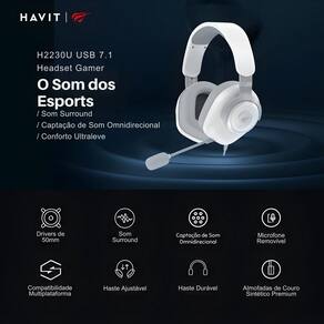 O Headset Havit H2230U eleva o patamar da sua experiência digital com o poder do áudio via conexão USB. Desenvolvido para entregar um som mais limpo e livre de interferências analógicas, este modelo é perfeito para quem busca processamento de áudio superior no PC ou notebooks. Com um design moderno e clean, ele une a tecnologia de som surround com o conforto absoluto das almofadas premium da Havit. Sobre a Marca Consolidada como uma gigante no setor de tecnologia gamer, a Havit foca em entregar periféricos que unem design arrojado e performance técnica. No Brasil, é a marca preferida de quem busca equipamentos de nível com durabilidade testada e aprovada por milhares de usuários. Funcionalidades Conexão USB Digital Plug and Play para maior fidelidade sonora. Microfone removível com cancelamento de ruído passivo para chats nítidos. Drivers de 50mm otimizados para equalização de graves e agudos. Haste flexível anti-quebra revestida para máxima durabilidade. Botões de controle integrados para ajustes rápidos de áudio e microfone. Benefícios Áudio Digital Imersivo: A conexão USB garante uma transmissão de dados estável, ideal para localizar inimigos pelo som. Praticidade Plug and Play: Basta conectar na porta USB do seu dispositivo e o reconhecimento é imediato, sem necessidade de placas de som externas. Ergonomia Avançada: Estrutura ultra leve que reduz a fadiga cervical durante longas sessões de streaming ou jogos. Estética Minimalista: Design em cores sóbrias que combina com qualquer setup gamer ou ambiente de trabalho. Conclusão O Havit H2230U é a escolha inteligente para o gamer moderno que prioriza a fidelidade do áudio digital e a praticidade do USB. Seja para dominar o campo de batalha ou para participar de reuniões de trabalho com voz clara, este headset oferece o desempenho técnico e o conforto necessários para o dia a dia. Ficha Técnica Completa Marca: Havit Modelo: H2230U Conexão: USB Digital Driver: 50mm Impedância: 32 15% Sensibilidade: 116dB 3dB Resposta de Frequência: 20Hz - 20kHz Microfone: Removível e Flexível Sensibilidade do Microfone: -38 3dB Comprimento do Cabo: 1.8 metros Peso: 241g Cor: Cinza/Branco Itens Inclusos 1 Headset Havit H2230U 1 Microfone Destacável 1 Manual do Usuário