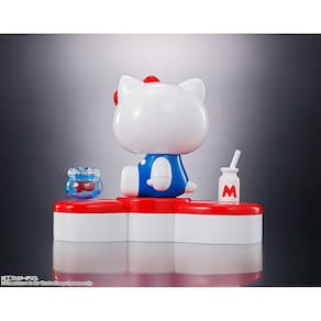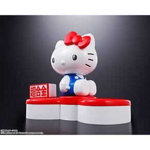 Hello Kitty Chogokin - 45th Anniversary - Bandai Hello Kitty completou 45 anos A Chogokin Hello Kitty está aqui Chogokin e Hello Kitty, ambos celebrando seu 45º aniversário, estão colaborando novamente As cores e acessórios são baseados na imagem dos anos 1970. Um tamanho fofo que cabe na palma da sua mão. O pescoço tem uma catraca e gira. A nossa linda mascote acompanha um conjunto de garrafa de leite e peixinho dourado. O logotipo Chogokin também pode ser exibido junto. Especificações do produto:- Altura geral: Aproximadamente 60 mm- Material: Metal fundido e ABS A caixa acompanha:- Corpo principal- Garrafa de leite- Peixe dourado- Logotipo Chogokin- Pedestal em formato de laço