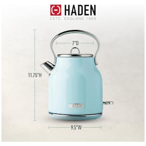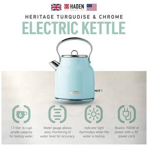 Chaleira elétrica Haden 75004 com capacidade de 1.7L (7 xícaras), potência de 1500W, base 360°, medidor de água, filtro removível, corpo em aço inoxidável sem BPA e desligamento automático.Características