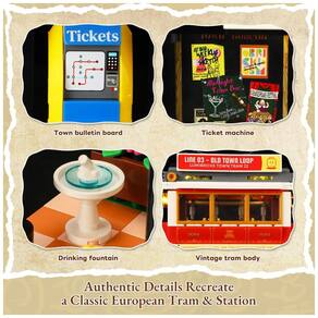 A base inclui conexões para outras ruas e prédios da série “Town Life”, permitindo unir o trilho a outros módulos e montar um circuito maior. O conjunto acompanha cinco minifiguras, como casal de antiquário, motorista do bonde, bartender e cantora/folksinger, que ajudam a criar histórias de deslocamento diário e vida noturna no centro histórico.??