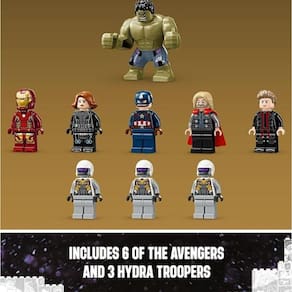 Heróis Marvel Vingadores Unidos: Era de Ultron Lego 76291 Conjunto dos Vingadores - Este brinquedo de Super-herói para construir recria a batalha épica de Vingadores: Era de Ultron da Marvel Studios com uma série de minifiguras LEGO Marvel e recursos autênticos Personagens colecionáveis dos Vingadores LEGO Marvel - Este brinquedo para construir inclui a Viúva Negra, o Capitão América, o Homem de Ferro, o Thor e 3 minifiguras de Soldados da Hidra, além de uma figura maior do Hulk Muitas maneiras de brincar - O conjunto é composto por 5 módulos, que podem ser configurados para infinitas possibilidades de brincadeiras ou combinados para criar uma exposição de Super-herói cativante Conjunto LEGO de aventuras para construir - Este modelo LEGO Marvel autenticamente detalhado inclui um veículo off-road montável, , acessórios e recursos divertidos para inspirar brincadeiras imaginativas Um presente dos Vingadores da Marvel para crianças - Presenteie fãs de Hulk, Thor, Viúva Negra, Capitão América e Gavião Arqueiro com este conjunto LEGO divertido repleto de minifiguras