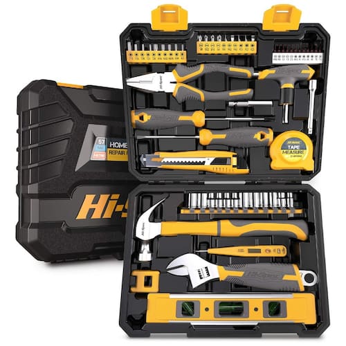 AQUI E PRONTO Conclua os trabalhos com mais facilidade e rapidez com o conjunto de kits de ferramentas para casa e garagem de 57 peças Hi Spec. Embalado com as ferramentas manuais mais alcançadas para iniciantes a usuários experientes que precisam de correções agora. Tudo em uma caixa de ferramentas dobrável e grossa com travas de pressão fortes FERRAMENTAS QUANDO MAIS NECESSÁRIAS Faça reparos, manutenção e bricolage em geral. Instale acessórios e acessórios, conserte a fiação, abra eletrodomésticos e eletrônicos quebrados, monte móveis, faça a manutenção de carros e bicicletas. Ou apenas como um kit de backup compacto para a estrada e ao ar livre GRANDES FERRAMENTAS PRÁTICAS Encontre cabos de ferramentas robustos com alças antiderrapantes contornadas que garantem que a força seja aplicada de forma segura e confortável. E por sua dureza extra, o aço cromo vanádio é com um revestimento de cromo ou níquel para um acabamento profissional MAIS POPULARMENTE Puxe, prenda e corte com o alicate combinado, peças de martelo e pregos extraíveis, meça e posicione com precisão com a fita retrátil e o nível de bolha e muito mais com seus acessórios de ferramentas extras Marca: Não Informado