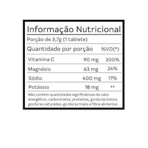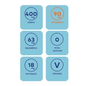 Peso da unidade: 4 g Ingredientes: Acidulantes Ácido Cítrico e Polietileno glicol,Antiumectante dióxido de silício,Aromatizante,Bicarbonato de Sódio e Polivinilpirrolidona,Cloreto de potássio,Edulcorantes Steviol,Estabilizantes Sorbitol,Ácido ascórbico,Óxido de magnésio Peso da porção: 37 g É livre de glúten: Sim Contém lactose: Não É vegano: Sim