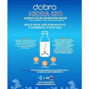 Características principais MarcaDobro LinhaHidratação Suplemento principalMinerais/vitaminas NomeHidra Iso - Repositor Eletrolítico Formato do suplementoTabs Efervescentes Tipo de embalagemTubo Unidades por embalagem10 Unidades por kit1 Peso líquido37 g