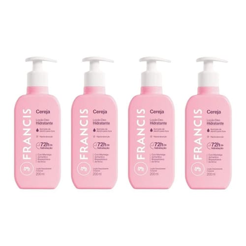 Hidratante corporal francis 200ml rosa - kit c/4un Descrição O hidratante corporal francis 200ml rosa oferece uma hidratação profunda e duradoura, deixando a pele macia, suave e delicadamente perfumada com uma fragrância floral e feminina. Enriquecido com ingredientes que nutrem e revitalizam a pele, este hidratante é ideal para todos os tipos de pele, especialmente as mais secas e desidratadas. A fragrância romântica de rosas transforma o cuidado diário em um momento de prazer e bem-estar. Sua fórmula leve e de rápida absorção permite uma aplicação fácil e uniforme, garantindo que a pele fique hidratada sem sensação de oleosidade. Com uma embalagem prática de 200ml, o hidratante corporal francis rosa é perfeito para uso diário, mantendo sua pele bem cuidada e perfumada ao longo do dia. Experimente o toque suave e a hidratação eficaz deste hidratante corporal e sinta a diferença na qualidade e aparência da sua pele. Ideal para quem busca um cuidado completo e uma pele sempre macia, saudável e com um aroma delicado e envolvente. Modo de uso Aplique uma quantidade adequada do hidratante corporal nas mãos. Espalhe suavemente sobre a pele limpa e seca, em movimentos circulares. Concentre a aplicação nas áreas mais ressecadas, como cotovelos e joelhos. Massageie até que o produto seja completamente absorvido pela pele. Use diariamente, de preferência após o banho, para manter a pele hidratada e perfumada ao longo do dia. Marca: Não Informado Ean: 7908945208785