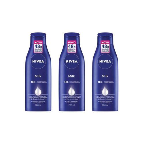 Hidratante Corporal Nivea 200Ml Milk Extra Seca - Kit Com 3Un DESCRIÇÃO O Hidratante Corporal Nivea 200ml Milk Extra Seca é um produto de cuidado com a pele da marca Nivea, especialmente formulado para pessoas com pele extra seca. O Hidratante Corporal Nivea 200ml Milk Extra Seca é a solução perfeita para quem sofre com a pele extra seca. Sua fórmula exclusiva é enriquecida com ingredientes altamente hidratantes que ajudam a restaurar a umidade natural da pele, proporcionando alívio imediato e duradouro. Este hidratante é conhecido por sua textura leve e de rápida absorção, que não deixa a pele com sensação de oleosidade. Ao mesmo tempo, proporciona uma intensa hidratação que deixa a pele suave, macia e com uma aparência saudável. Modo de Usar Limpeza: Antes de aplicar o hidratante, é importante lavar a pele com água morna e sabonete suave para remover sujeira e impurezas. Secagem: Certifique-se de que a pele esteja completamente seca antes de aplicar o hidratante. Isso ajuda a garantir que o produto seja absorvido adequadamente. Aplicação: Coloque uma quantidade suficiente do hidratante nas mãos e espalhe-o suavemente sobre a pele. Você pode aplicá-lo em todo o corpo ou nas áreas que mais precisam de hidratação, como pernas, braços, cotovelos e joelhos. Massagem: Massageie o hidratante na pele com movimentos suaves e circulares. Isso ajuda a melhorar a absorção do produto e a relaxar a pele. Tempo de absorção: Deixe o hidratante ser absorvido pela pele por alguns minutos antes de se vestir para evitar que o produto manche suas roupas. Frequência: Use hidratante corporal diariamente, de preferência após o banho ou sempre que sentir que sua pele está seca. Ean: 7908825713613