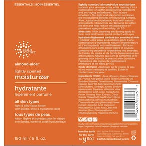 Vegano. Todos os tipos de pele. Loção facial leve e sedosa com jojoba, karité e ácido hialurônico. Hidratante de amêndoa e aloe levemente perfumado. Hidrate sua pele todos os dias enquanto a trata com uma combinação de ingredientes reabastecedores da terra e antioxidantes antienvelhecimento. Rica em emolientes puros, esta loção leve e sedosa combina os benefícios hidratantes da amêndoa nutritiva, aloe, jojoba e ácido hialurônico com antioxidantes naturais, camomila e ginseng, para suavizar a pele e ajudar a reduzir a aparência de envelhecimento precoce e rugas. pH 5,5. Sem parabenos. Fragrância natural. Da terra, para a terra, para você. EarthScienceBeauty.com. Feito nos EUA.