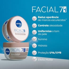 NIVEA Creme Facial Uniformizador Beleza Radiante é um hidratante 7 em 1 desenvolvido para atender às necessidades da pele negra. Com uma fórmula inovadora, enriquecida com ácido hialurônico, extrato de pérolas e cúrcuma, reduz marcas escurecidas*, uniformiza o tom e ilumina a pele, garantindo hidratação profunda sem sensação oleosa.