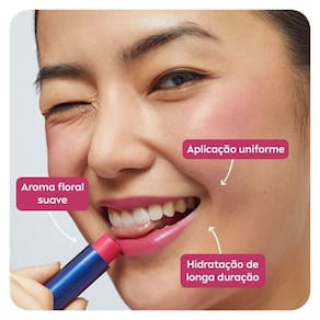 Benefícios e diferenciais: - Aroma floral suave - Hidratação de longa duração - Com Vitamina E - Livre de óleo mineral - Com Óleo de Amêndoas orgânico - Protege contra o ressecamento - Acabamento rosa intenso - Embalagem reciclável - Aplicação uniforme, sem a necessidade de espelho - Com Manteiga de Karité obtida de forma responsável