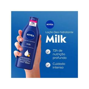 NIVEA Loção Deo-Hidratante Milk é um hidratante corporal que garante um cuidado intenso, com 72h de hidratação para uma pele mais saudável a cada uso. Para que serve? Enriquecida com ácido hialurônico puro, óleo de amêndoas e sérum de nutrição profunda, a loção deo-hidratante proporciona uma hidratação profunda para a pele seca a extrasseca. Benefícios e diferenciais: Hidratação profunda por 72 horas Cuidado intenso Nutrição profunda Não oleoso e de rápida absorção Dermatologicamente testado.Aviso:Uso externo. Não é indicado para uso no rosto. Em caso de irritação, suspenda o uso e procure orientação médica. Manter em local seco e arejado, ao abrigo de luz e fora do alcance de crianças.
