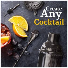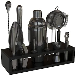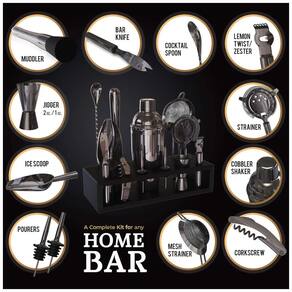 FERRAMENTAS DE DESTAQUE Nosso Muddler é mais longo do que a maioria dos Muddlers comumente s por mixologistas. Feito desta forma para que você não precise se preocupar em espremer sua mão em sua coqueteleira de 740 mL A colher em nosso conjunto é mais profunda do que o normal e contém mais gelo para que você possa esquecer o frio Oferecemos também um zester, para enfeitar sua bebida, nenhum kit bar está completo sem ele, também é um descascador Nosso conjunto de bar tem dois coadores diferentes, cada um com seu propósito especial para misturar coquetéis. ACABAMENTO MATTE Ao contrário da maioria dos conjuntos de bar, o nosso é coberto com um acabamento preto fosco, dando a este barware um visual preto fosco muito elegante. Todos os acessórios da barra ainda podem ser lavados na máquina de lavar louça, facilitando a limpeza. Nossas ferramentas de bartender não enferrujam nem descascam. Todas as ferramentas são testadas para garantir que seus conjuntos de coquetéis durem uma vida inteira SUPORTE À PROVA DE MANCHA O suporte de bambu preto resistente que contém nossos acessórios de álcool é feito de bambu real. Coberto com uma tinta à prova de estanqueidade, este suporte zenará suprimentos de bar nos próximos anos PRESENTE PENSADO Elegante em seu design, é um presente maravilhoso para qualquer festa de coquetel que você participe. Certamente para impressionar seus amigos com seu gosto impecável em design. Este conjunto de bn vem em uma caixa de presente projetada, não em uma caixa branca comum