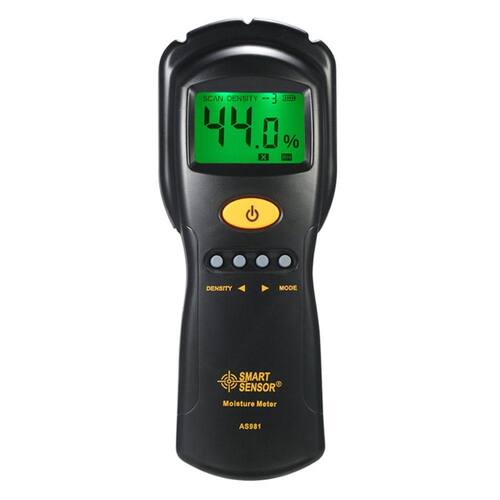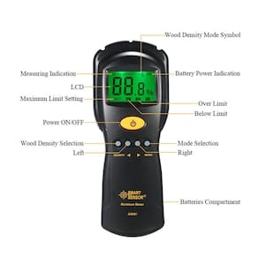 Características destacadas 1. Medição de ondas eletromagnéticas de alta frequência: meça rapidamente o teor de umidade de muitos tipos de materiais de madeira. 2. Grande display LCD de madeira com ampla faixa de 2% ~ 70% RH, resolução: 0,5%, precisão: ± (1% RH+0,5). 3. Desempenho estável e resposta rápida e confiável para empreiteiros, carpinteiros e proprietários medirem a água que contém a maior parte da madeira, bambu, papel, ervas, livros, blocos de madeira, papelão, etc. 4 10 Modos de seleção da densidade da madeira: Pressione o botão de densidade para selecionar a densidade de madeira apropriada (0, 1, 2, 3, 4, 5, 6, 7, 8, 9). 5. Mais prático com função versátil: desligamento automático em 3 minutos sem qualquer operação, função de retenção de dados, grande display LCD com luz de fundo selecionável, fácil de ler. Veja menos