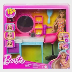 - Contém: 1 Boneca, 1 Balcão de Beleza, 1 Secador, 1 Chapinha, 1 Escova, Elasticos e Chuchas Para Cabelo, Tesoura, Acessórios Para Lavagem dos Cabelos, Acessórios para enfeite de Cabelo,