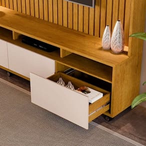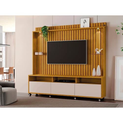 Transforme a sua sala de estar com o Home Absoluto Ripado - Carmolar Móveis, seu design ripado confere um toque contemporâneo, enquanto a iluminação LED embutida adiciona um brilho envolvente. Com três gavetas, você pode organizar seus itens com facilidade, mantendo a ordem no espaço. As prateleiras proporcionam um local elegante para exibir objetos de decoração. A combinação de materiais premium, como madeira ripada, vidro e iluminação LED, cria um contraste sofisticado que eleva o charme da sua sala.Dimensões do Produto Montado:Altura: 190cmLargura: 190cmProfundidade: 39,5cmObservações:– Ideal para TVs até 60 polegadas– Corrediças telescópicas– 2 prateleiras de vidro– 2 luminárias de Led– 3 gavetasMarca: Carmolar MóveisModelo: AbsolutoReferência: 1582485WATENÇÃO: Não nos responsabilizamos pela montagem deste produto. Aconselhamos a contratação de um profissional.